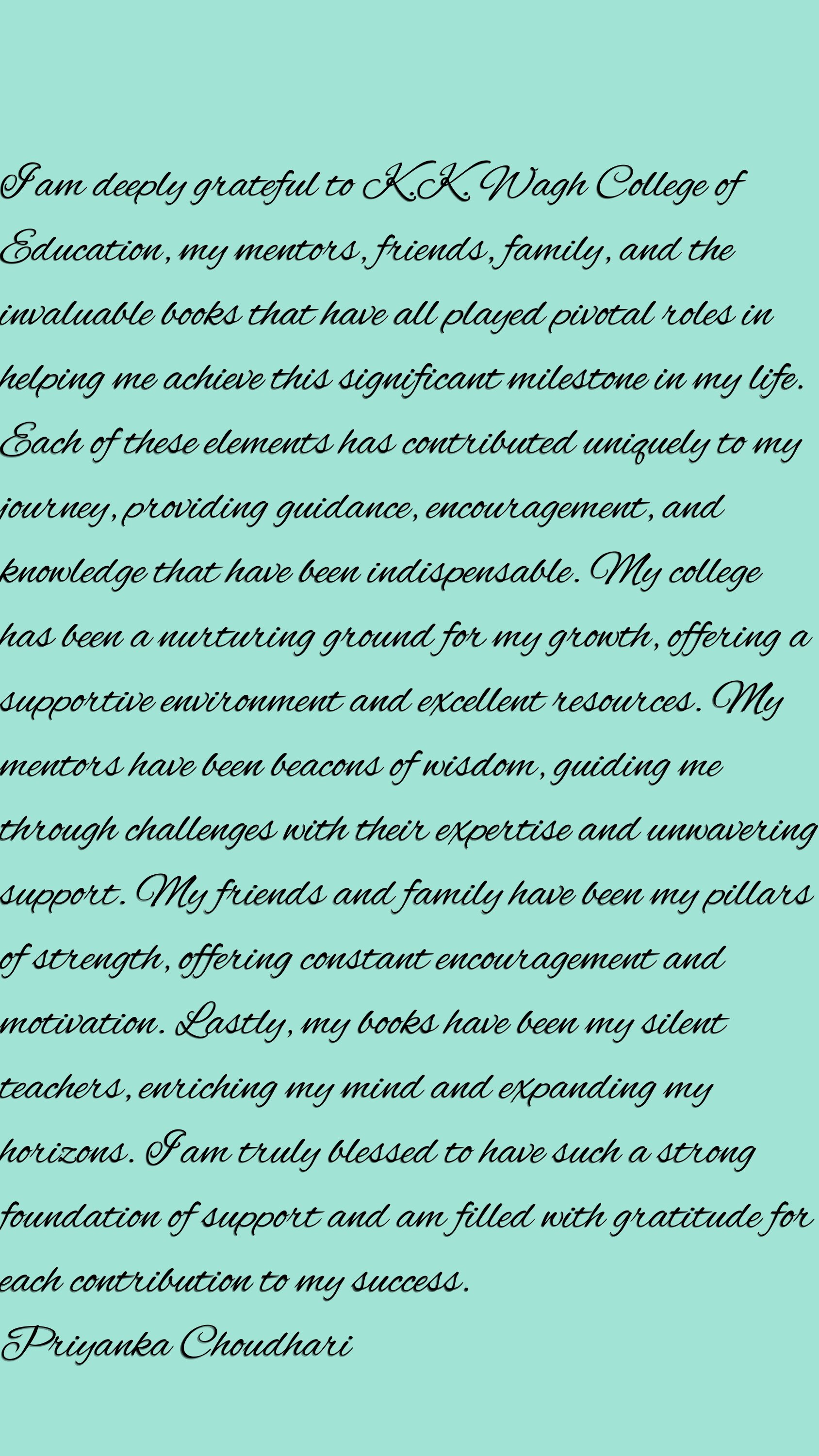 From the very beginning of my B.Ed program, I was deeply inspired by the idea of shaping young minds and making a positive impact on society. Each lecture, assignment, and classroom experience during my B.Ed not only enriched my knowledge but also strengthened my passion for teaching. I immersed myself in understanding child psychology, innovative teaching methods, and the importance of patience, empathy, and creativity in education.